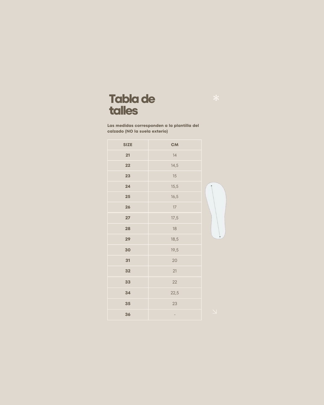 | Talle | 21, 22, 23, 24, 25, 26, 27, 28, 29, 30, 31, 32 |