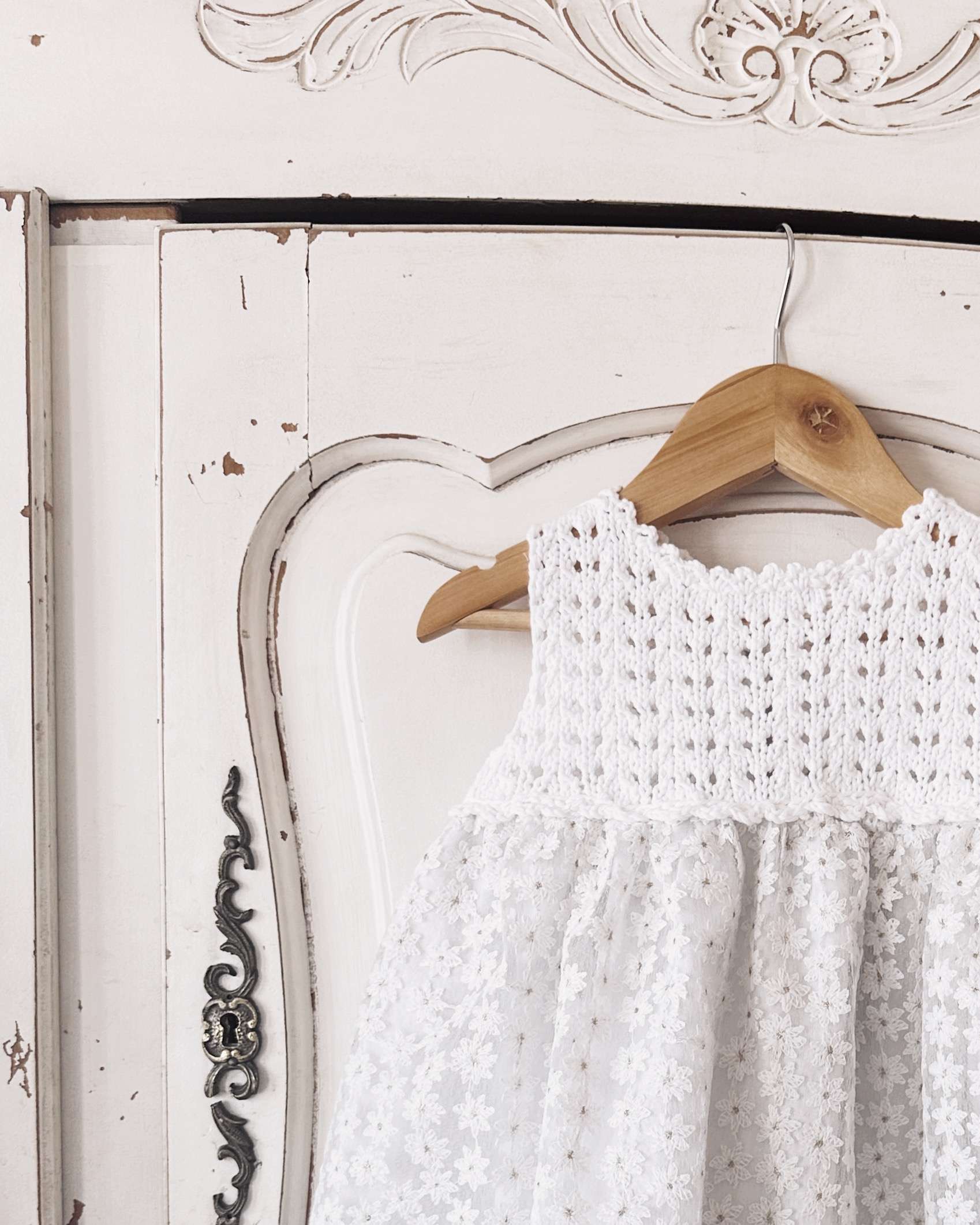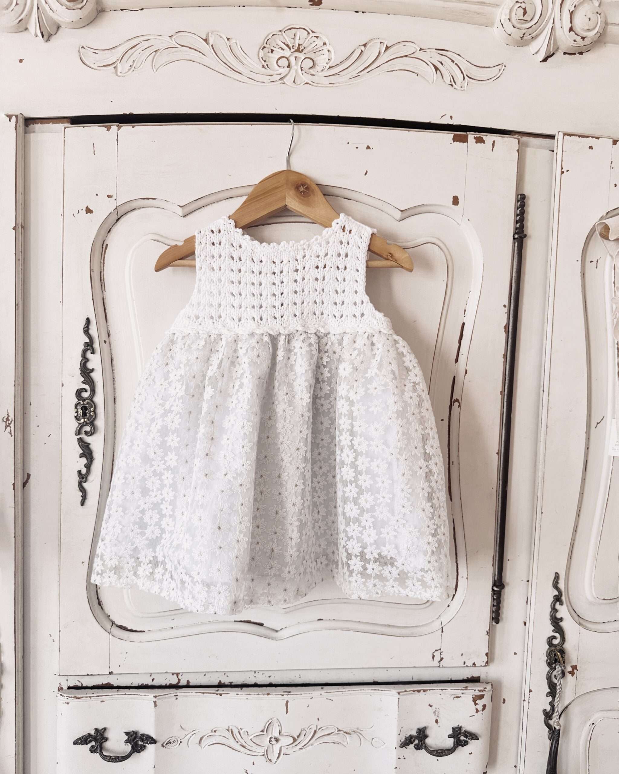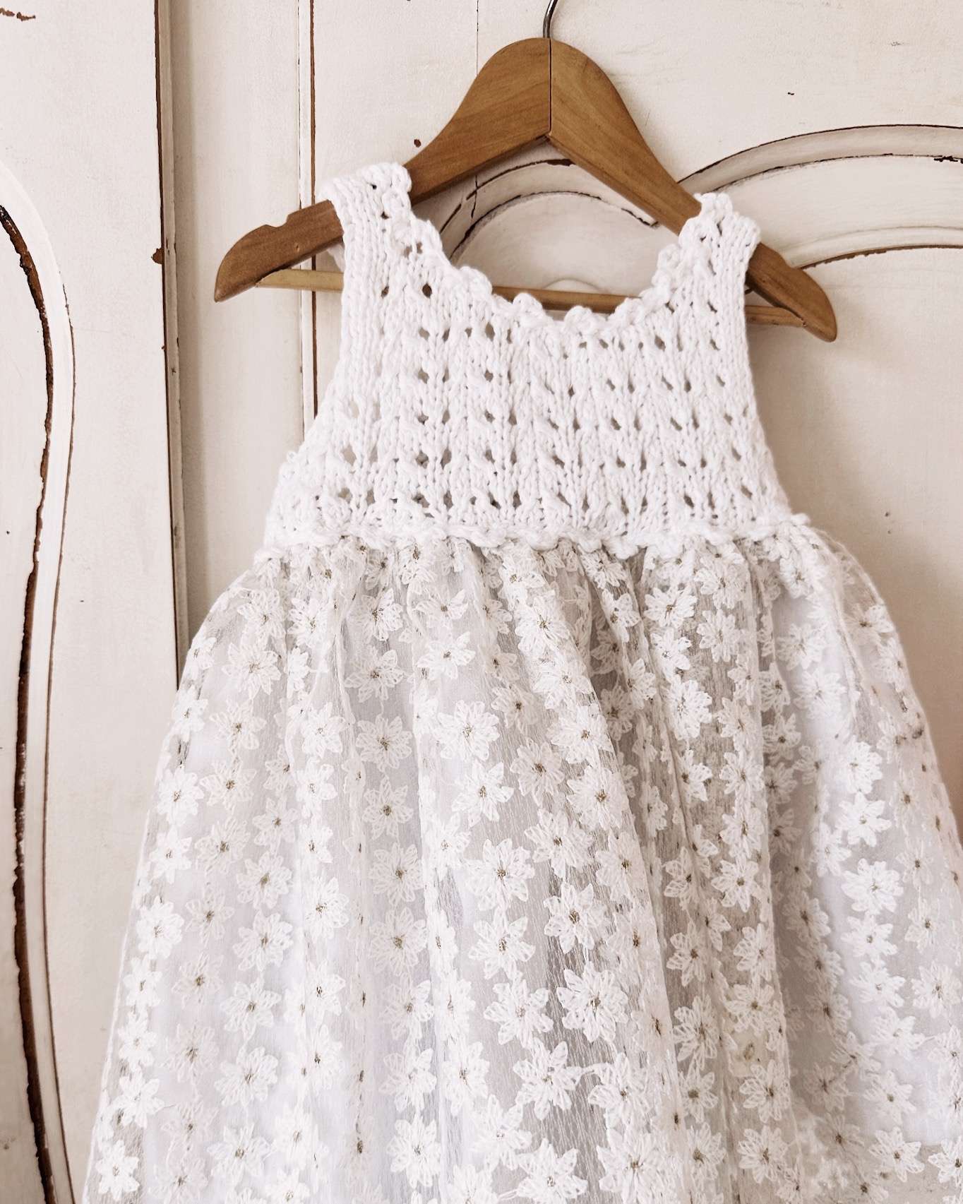 Lule es un vestido con el canesu tejido en hilo de algodon y la pollera de tela con margaritas bordadas